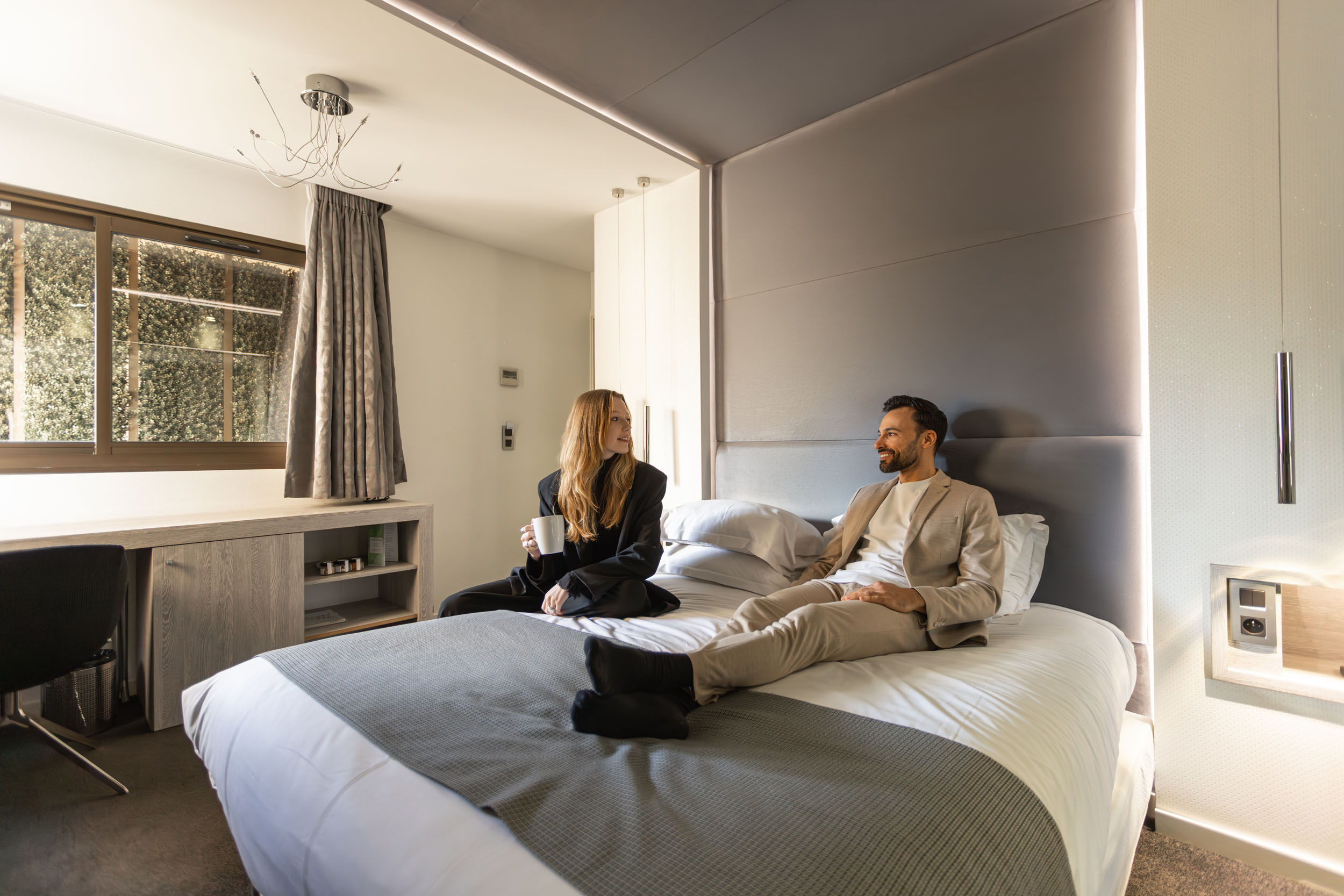 With its 18 square metres, the room unfolds in soft, natural tones. A pleasant desk allows you to work serenely if needed without disturbing the gentle atmosphere. Clean lines and soft materials create a restful space, true to the spirit of the Cézanne.